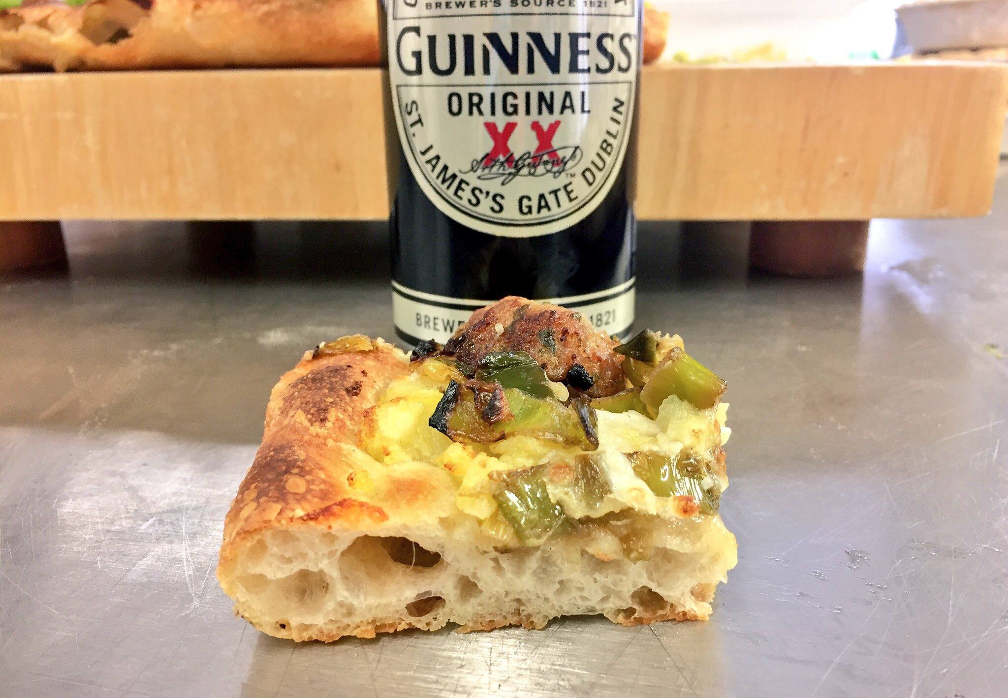 The second one is our Guinness Pizza, with mash potato, Guinness sautéed leek and Irish Guinness sausage…what a winning combo!