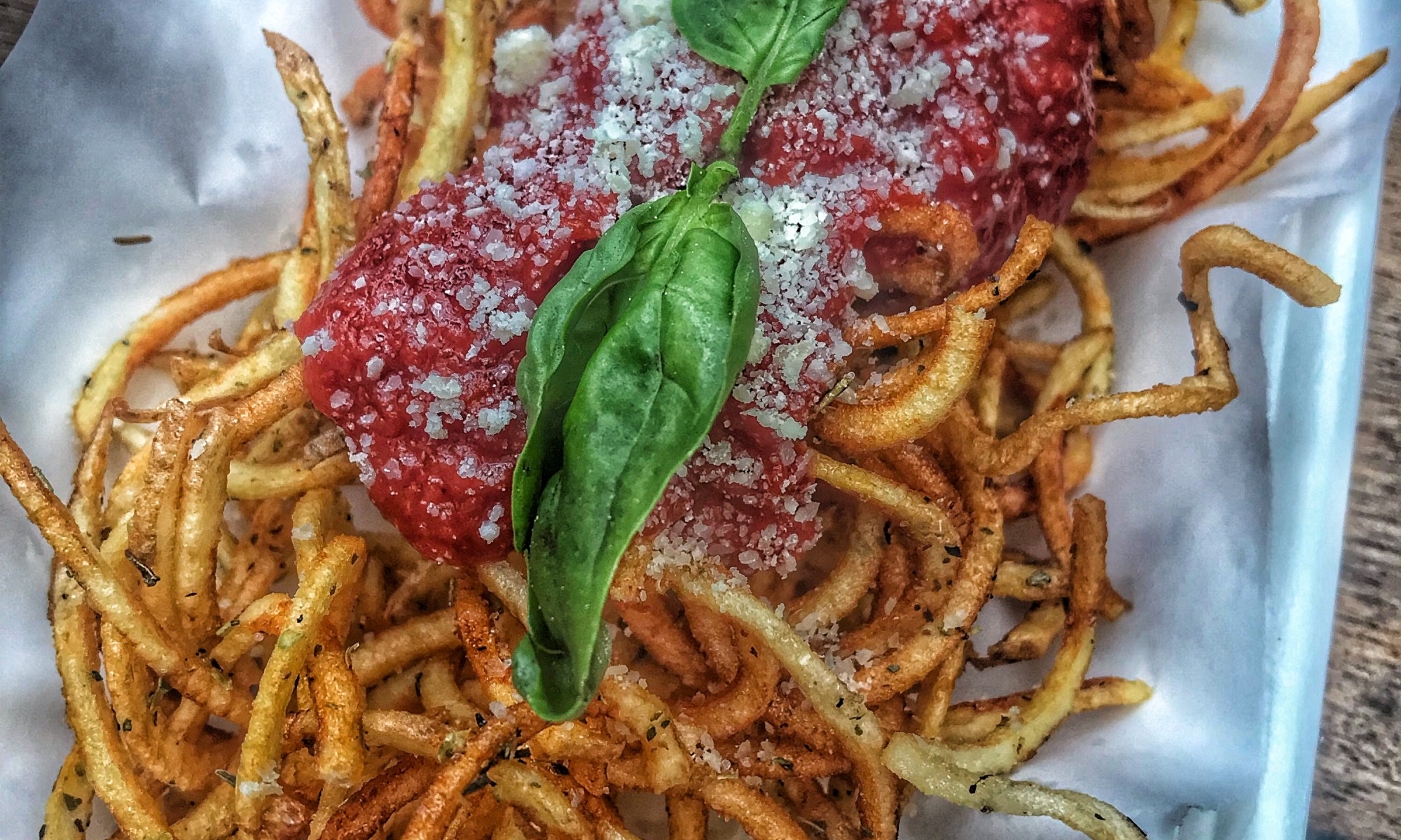 The experience at the KAZIMIER GARDEN allows us to play around with new recipes and to do some crazy experiments. The Garden will be forever our SPAGHETTI FRIES home – loaded curly hand-cut fries with pizza sauce, parmesan, mayo and fresh basil….GENIUS!