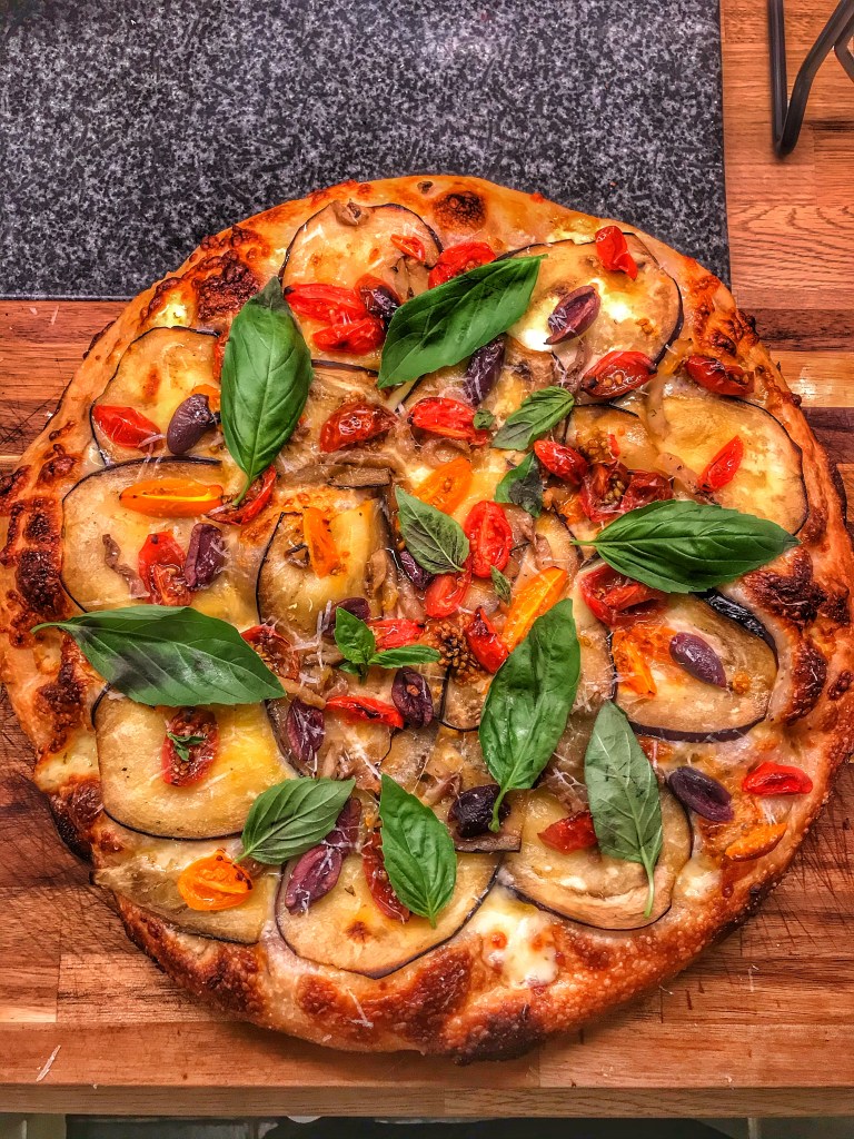 MOZZARELLA, CHERRY TOMATO, AUBERGINE, BLACK OLIVE, BASIL