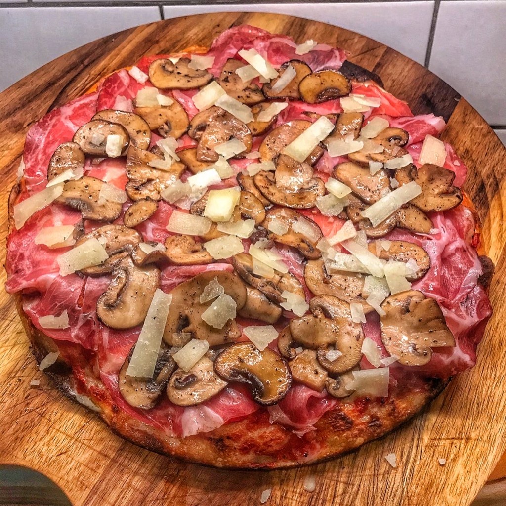 TOMATO SAUCE, MOZZARELLA, COPPA HAM, MUSHROOM, PECORINO