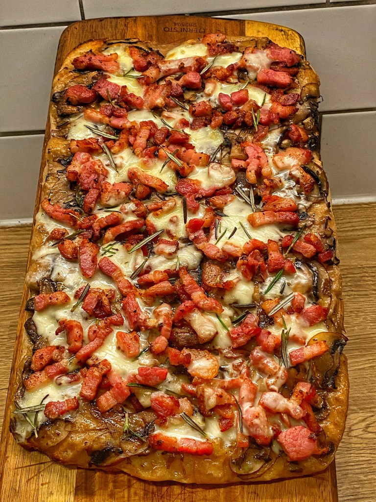 This was probably one of the coolest pizzas we ever made! To celebrate the #Worldpizzaday we decided to make a very special pizza. We have used for our dough a unique blend of flours: 400g Chapatti flour, 50g Semola rimacinata, 50g spelt flour – slowly fermented over 24 hours. Then we laid a thick layer of chestnut mushroom on an oven tray, covered with the pizza dough & baked for 15 mins. Once out the oven we flipped it over into another tray, added crispy pancetta bites, Taleggio cheese and sprinkle some fresh rosemary, and baked for further 3 minutes! The result was UNBELIEVABLE.