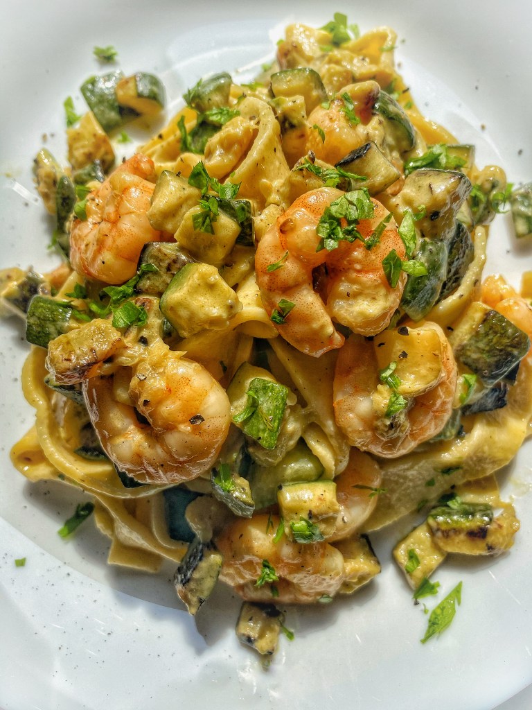 We are starting to love this life at home, treating ourselves more than ever! Today we had for lunch another easy and quick pasta. You only need a courgette, few king prawns and a splash of double cream. Sprinkle some oil in a frypan, add a crushed garlic clove, as soon as you smell the garlic add the diced courgette, season it and cook for about 10 minutes on medium heat. Then add the prawns and cook for further 5 minutes. Heat off. When the pasta is ready transfer over to the sauce pan, add a ladle of its water, and a tablespoon of cream. Let it go on high heat just for a couple of minutes.. and that’s it..DINNER IS READY! You can sprinkle some fresh parsley and black pepper as you like. BUON APPETITO.