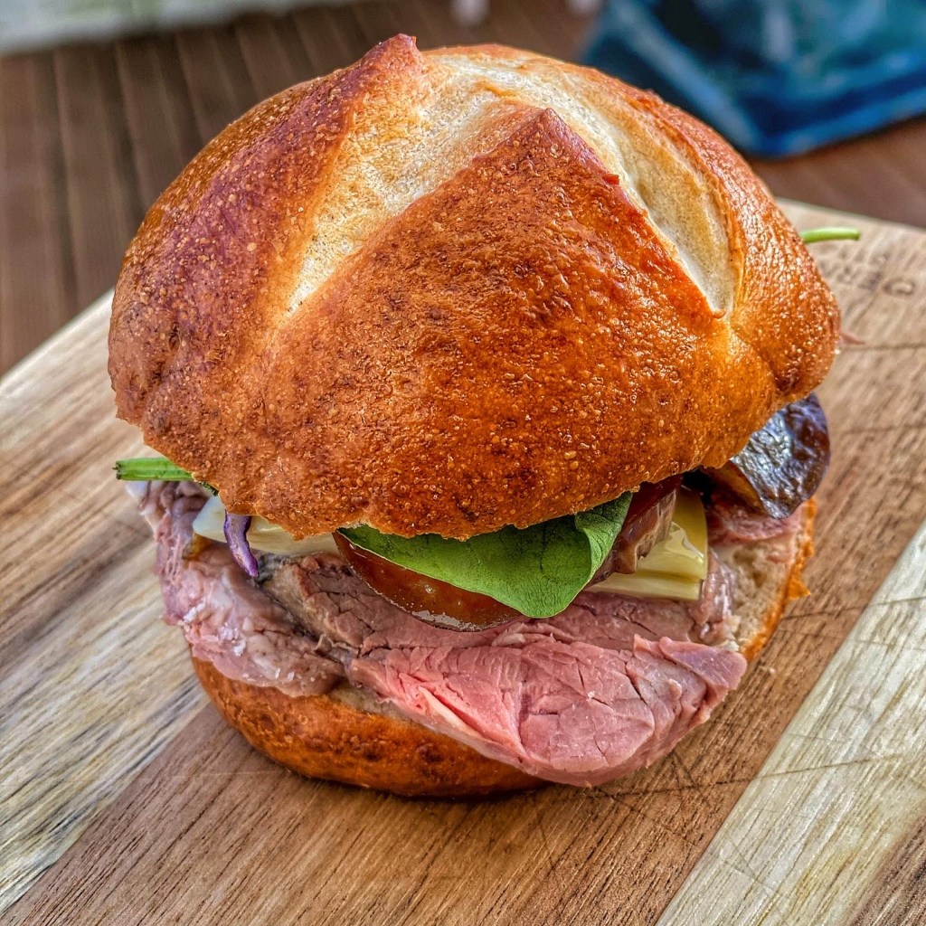 Preztel buns are soft and spongy inside, with a thin brown crust. The secret to these buns is giving them a quick bath in a boiling alkaline solution before popping them in the oven — this is what gives them their distinctive flavour and colour. We used baking soda to give the water a high pH level. This was our first attempt in making them, not perfect looking but flavour and texture was spot on! We filled them with MAYO, ROAST BEEF, ARTICHOKE, GRILLED AUBERGINE, SPINACH LEAVES & RED CABBAGE!