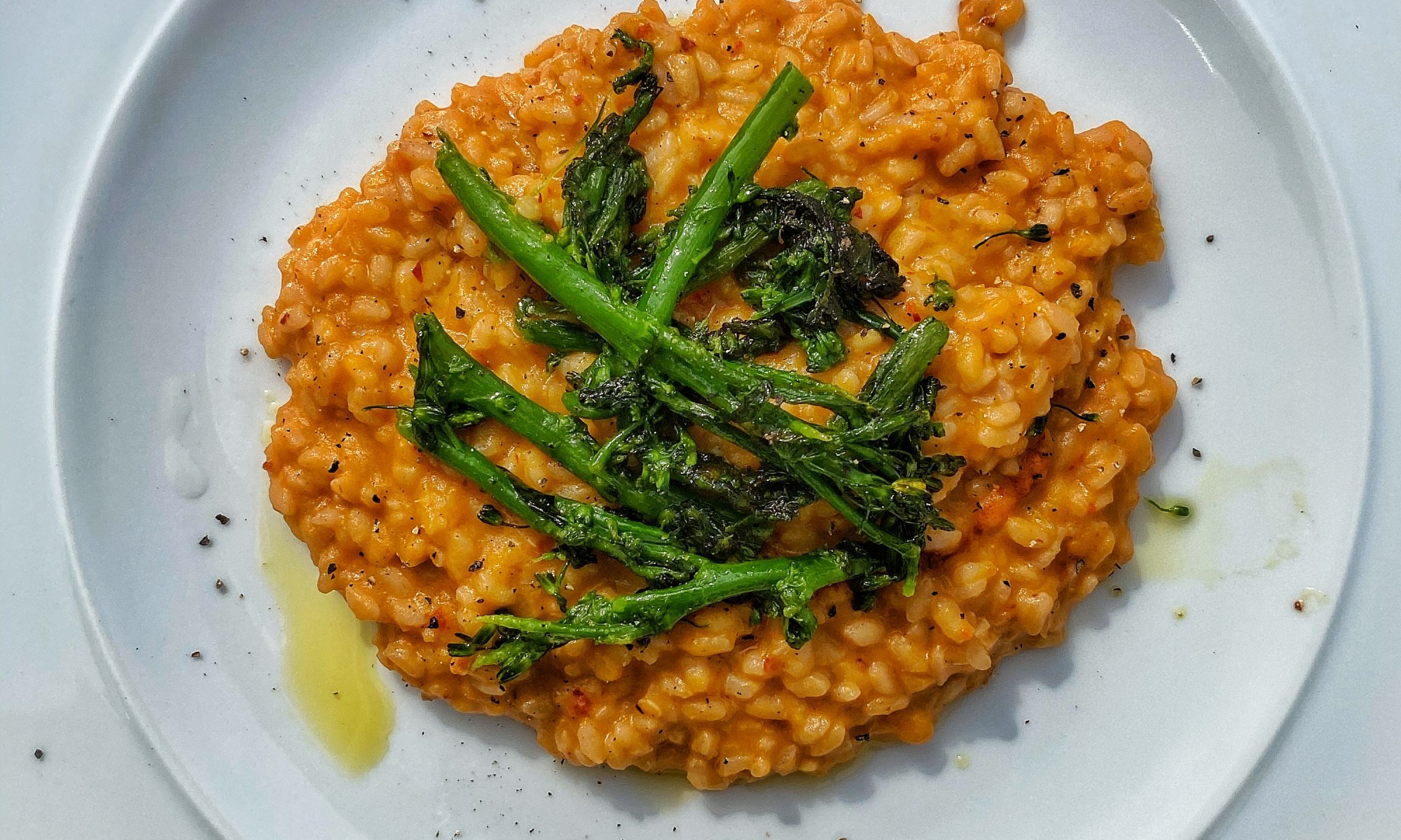 Start making the soffritto, toast the rice for a couple of minutes, add a ladle at time of vegetable stock, after 10 minutes add the butternut squash purée (previously roasted for about 20 minutes). When the rice is cooked, heat off, add some ‘Nduja, Parmesan and a bit of butter and Mantecare (mix it thoroughly). Top it up with few fried & crispy broccoli tender stem and serve it!