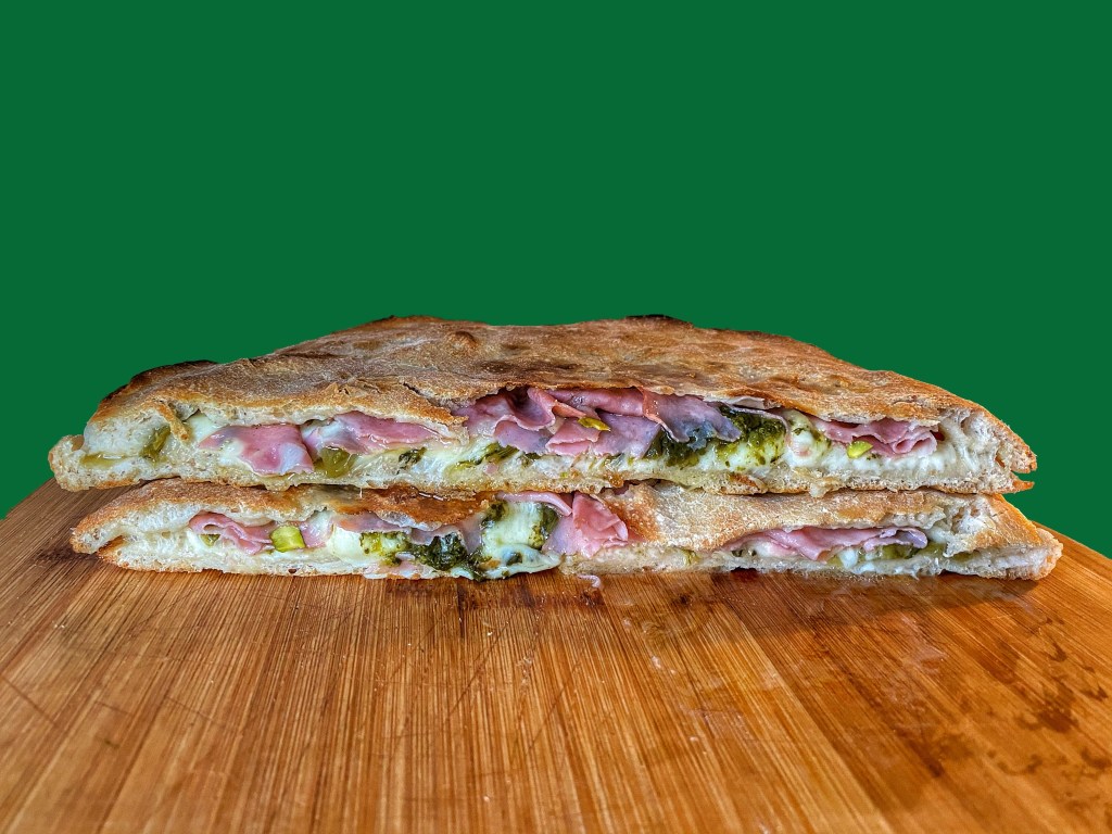 With the same dough you can make a focaccia ripiena using two pizza bases: stretch one at the bottom in a well oily oven tray, add your favourite ingredients (in our case mozzarella, friarelli & mortadella!), and close with another stretched pizza base as a lid. Make sure you seal the edges and with a fork make some holes on the surface. Bake it for 12-15 minutes at 240C°.