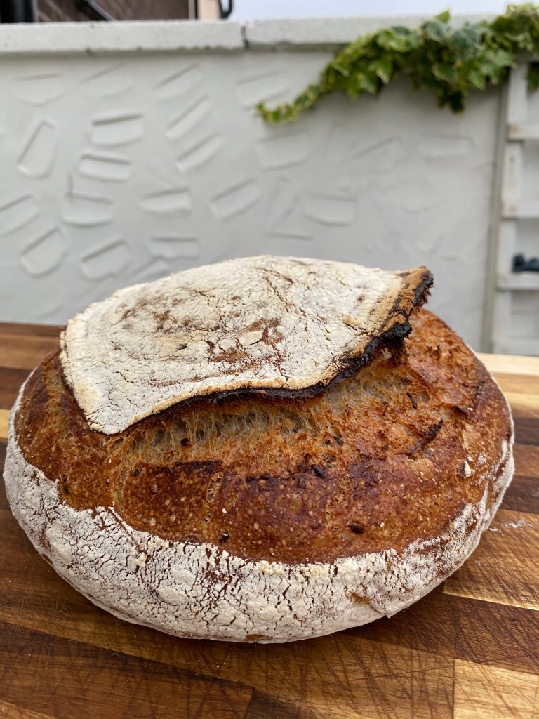 Mix all the water with the flours in a plastic bowl, cover with cling film and leave it for an hour at room temperature (auto-lyse). After this time add the starter. Another 30 minutes rest and after this time add salt and mix it thoroughly. Fold the dough every 45 minutes for about 2 hours. Leave it at room temperature for 6 hours (bulk fermentation). Shape it and transfer over to the fridge (6C°) for 12 hours. Bake it in a preheated dutch oven pan with the lid on at 250C° for 20 minutes, take the lid off and bake for further 25 mins at 230C°