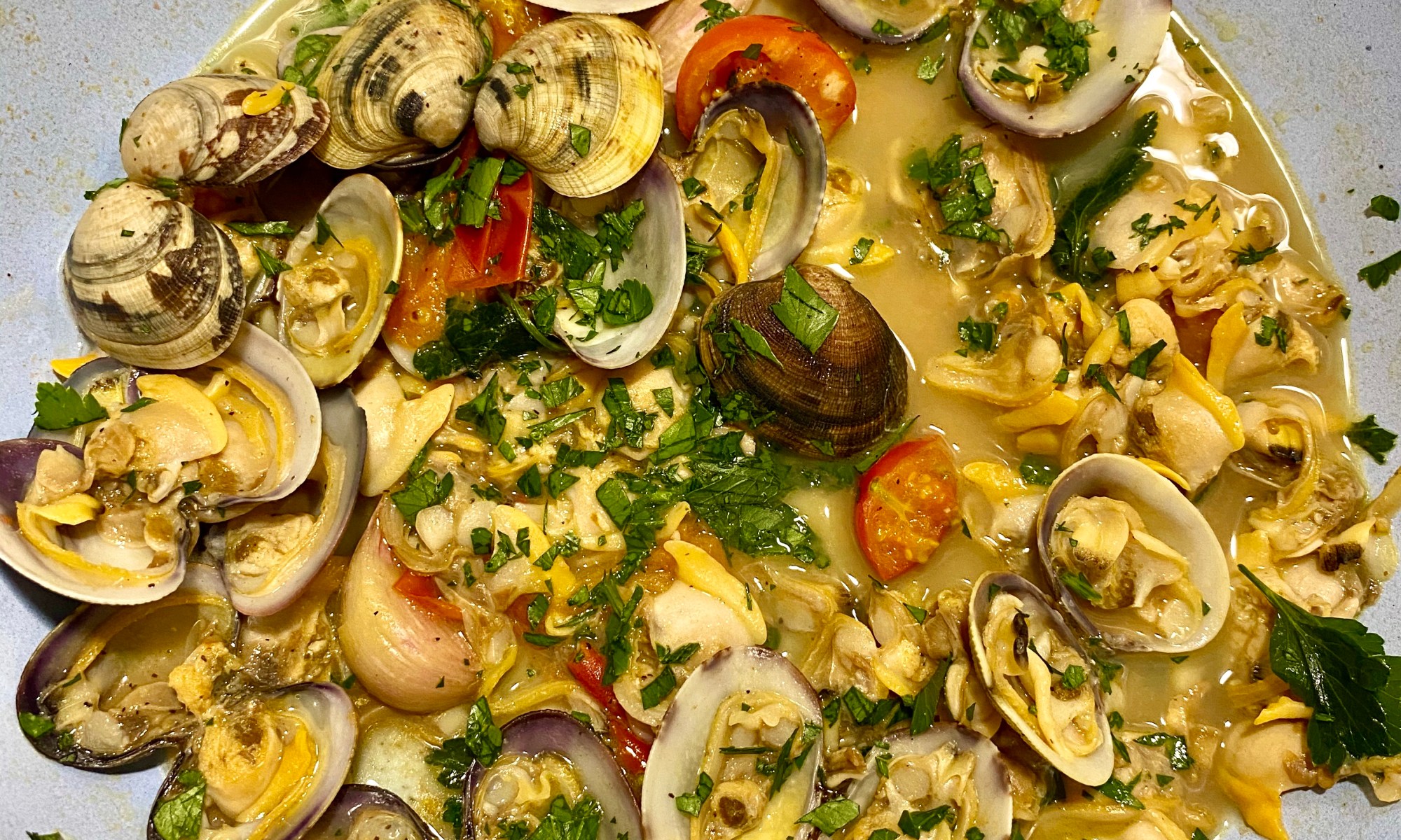 Super easy & straightforward to make it: put the clams (already cleaned – soak them in water & salt for about an hour) in a saucepan with a drizzle of oil, crushed garlic glove, some parsley (unchopped) and five cherry tomatoes cut in half on high heat. After a couple of minutes add a splash of white wine (or Prosecco in our case) and let it evaporate, cook it for further 5 minutes. Add the pasta with some cooking water to the clam sauce, toss the pasta for 30 seconds on high heat. Heat off, generously sprinkle extra virgin olive oil and a big handful of chopped parsley! SERVE EAT ENJOY