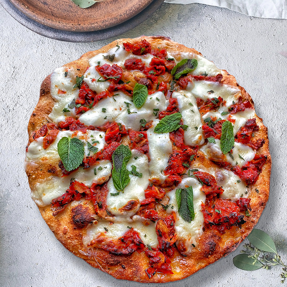 Cook your pizza base for about 6 minutes in your domestic oven at max temperature (250 C), then add big chunks of mozzarella, some roughly chopped sun-dried tomatoes and squeeze half a lime on it. Put it back in the oven for further 3/4mins. When out sprinkle some mint leaves 🍃 THAT’S YOUR MOJITO PIZZA!