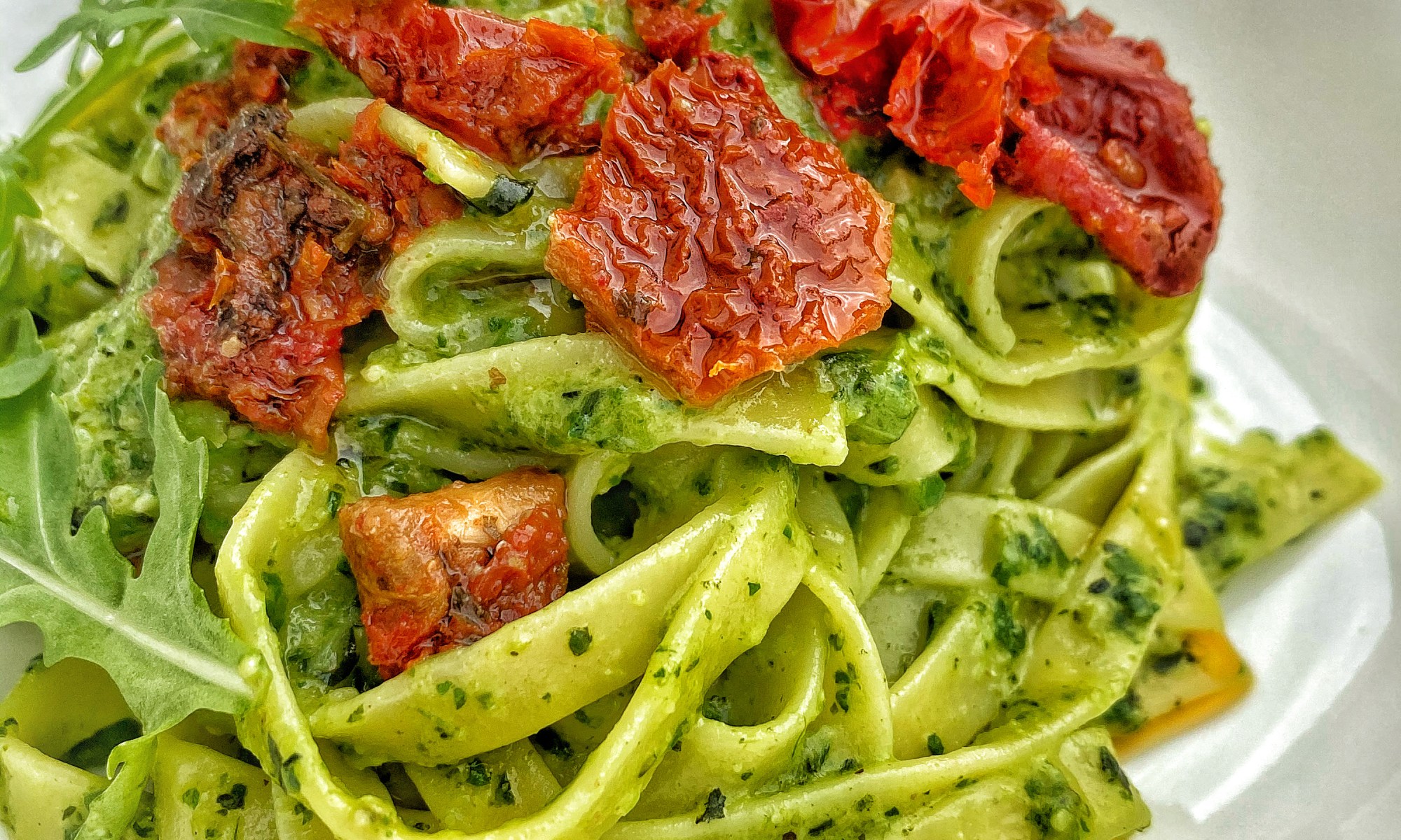 In an electric hand blender we put 5 little broccoli heads (previously boiled), 3 anchovies, about 40g basil, a handful of rocket leaves, 30g mixed nuts (walnuts, cashews), handful of Parmesan, pinch of salt, oil (20-50g); blend it until all combined. Add few spoons of the PESTO in the pasta pan (keeping some of the water) – just before the pasta is ready.