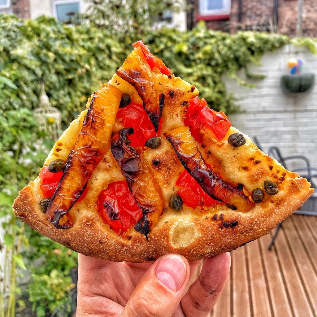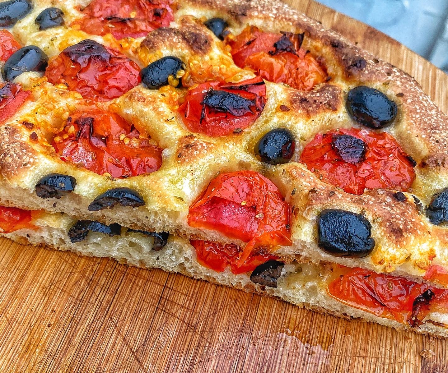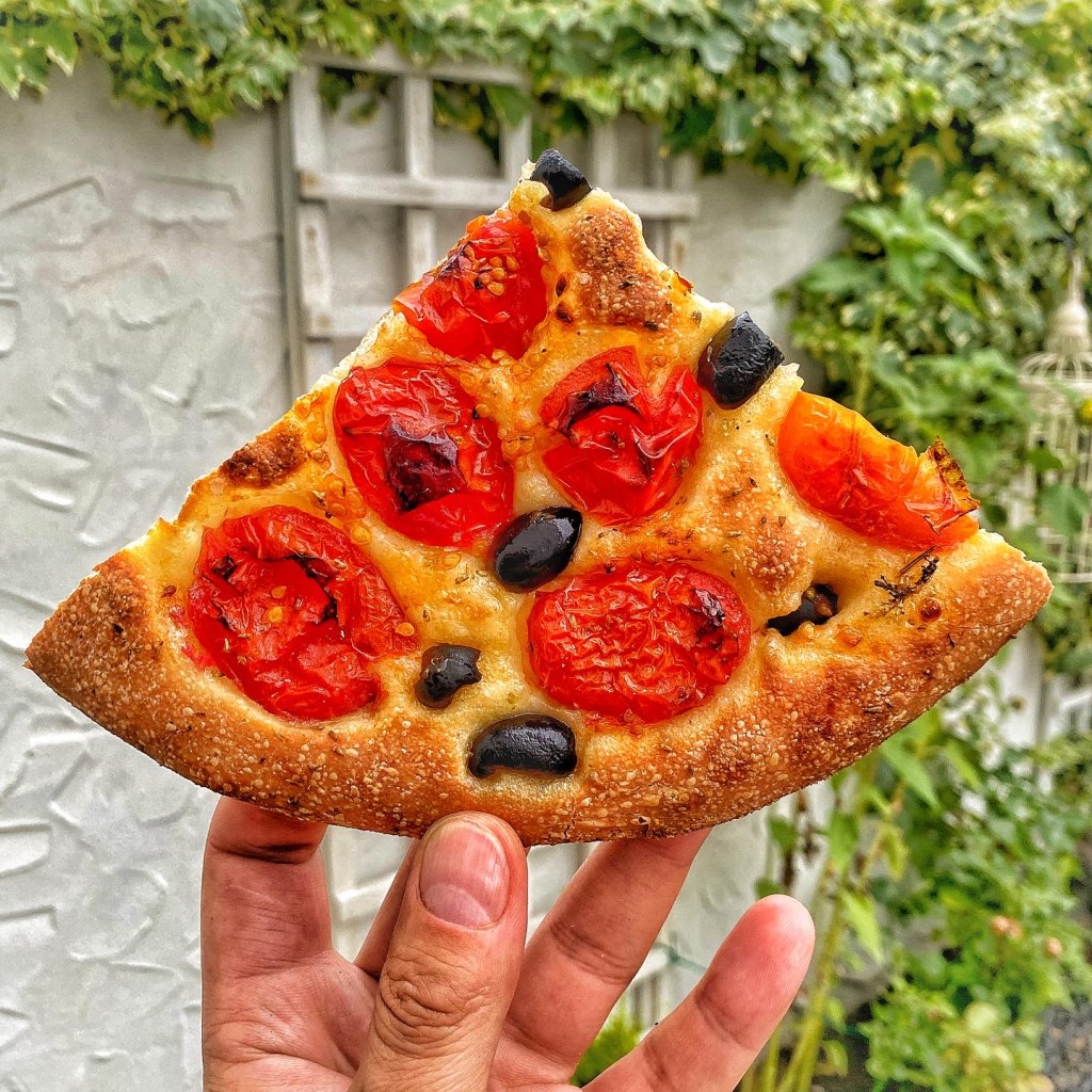 > Bake at 250c (fan mode oven settings) one focaccia at time right in the middle for 9/10 minutes.