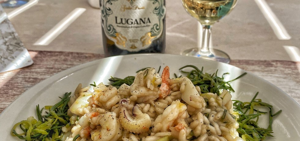 SEAFOOD RISOTTO with SAMPHIRE, CUTTLEFISH & PRAWNS 🦐 paired with a beautiful cold LUGANA white wine…what a lunch!